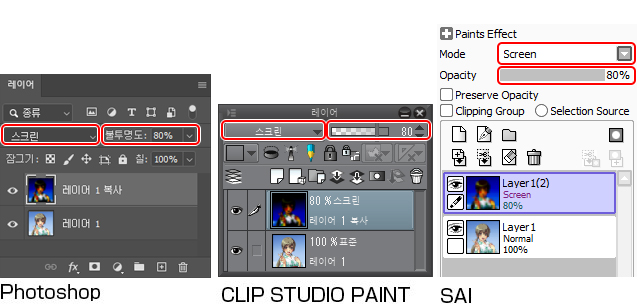 레이어 색을 조정한 후 레이어를 흐립니다. Photoshop/CLIP STUDIO PAINT와 SAI에서는 방법이 다릅니다.