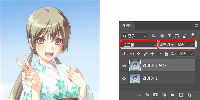 복제한 레이어를 선택하고 합성 모드를 [스크린]으로 설정하여 [불투명도]로 빛 상태를 조정합니다.