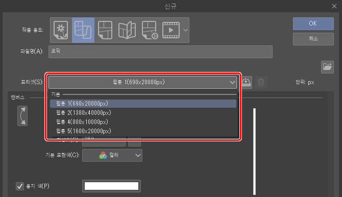 [신규 캔버스] 다이얼로그의 [작품 용도]에서 ‘웹툰’을 선택하면 웹툰용 항목이 표시됩니다.