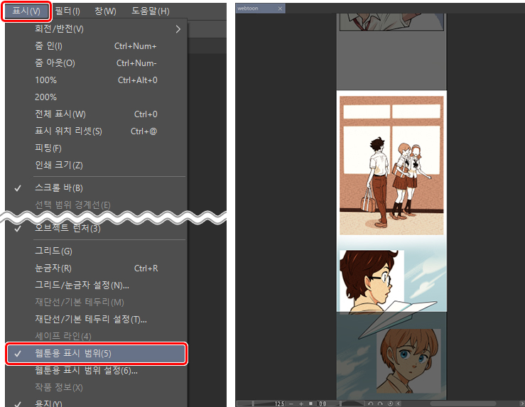 [표시] 메뉴 → [웹툰용 표시 범위]를 ON으로 설정하면 스마트폰 화면 비율로 편집 중인 캔버스를 확인할 수 있습니다.