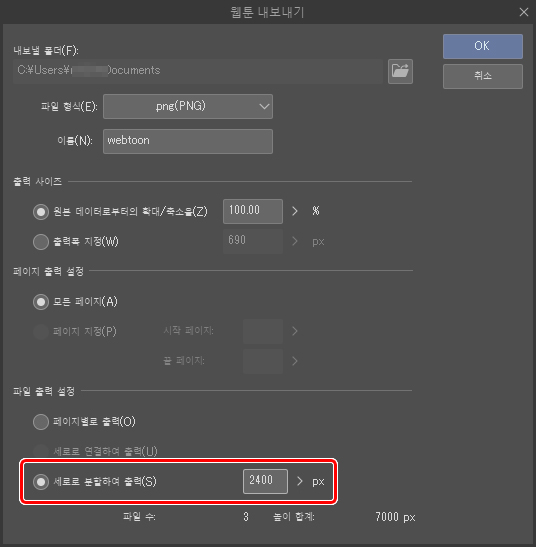 웹툰용 분할 내보내기는 [파일] 메뉴 → [웹툰 내보내기]에서 설정할 수 있습니다.