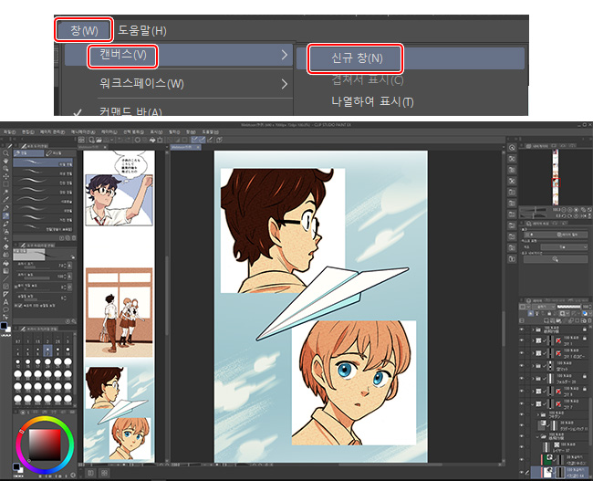 ▼ [창] 메뉴 → [캔버스] → [신규 창]을 선택하면 작업 중인 캔버스를 여러 창으로 표시할 수 있습니다.