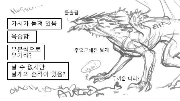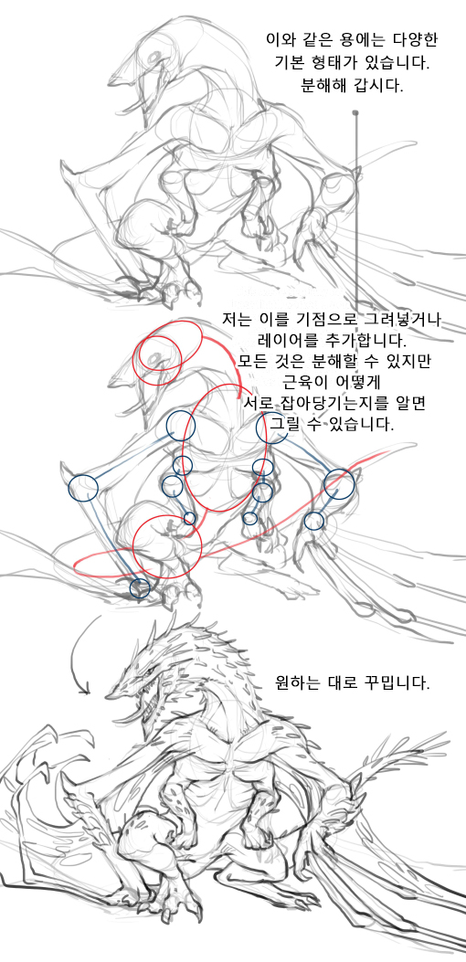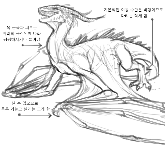용을 그리는 데 보다 독특한 문제는 용에 손, 발, 날개를 부여하고자 한다면 흥미로운 생체 구조를 구상해야 한다는 데 있습니다. 특히 날개를 단다는 것은 ‘제3의 손발’을 추가하는 것이기 때문입니다.