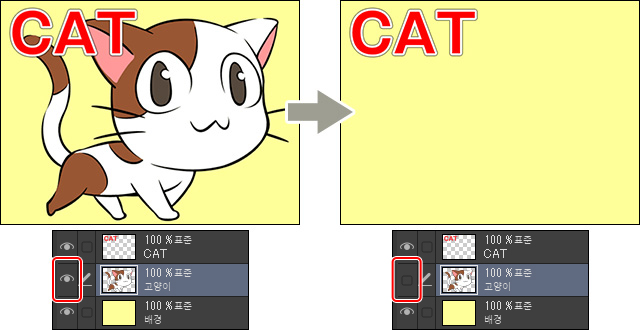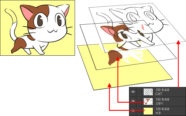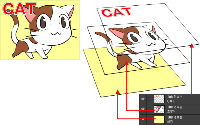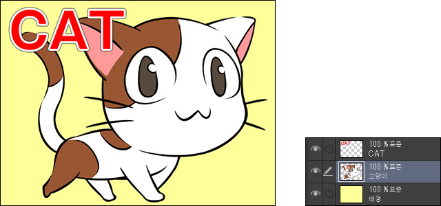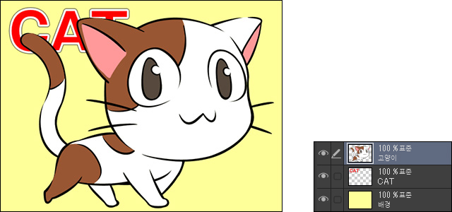 이 일러스트는 영문자 ‘CAT’, ‘고양이’, ‘배경’의 레이어 세 장이 사용되었습니다.