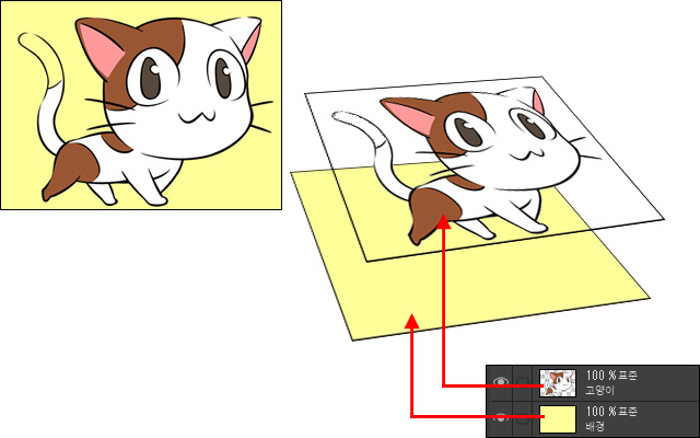 레이어는 [레이어 패널]이나 [레이어] 팔레트에 표시된 순서로 겹쳐 있습니다. 아래 레이어는 위 레이어에 그려진 것에 가려져 보이지 않게 됩니다.