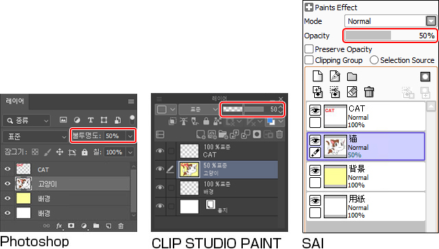 레이어별로 불투명도를 변경할 수 있습니다. 불투명도를 낮추면 레이어가 투명해져 아래 레이어가 비쳐 보입니다.
