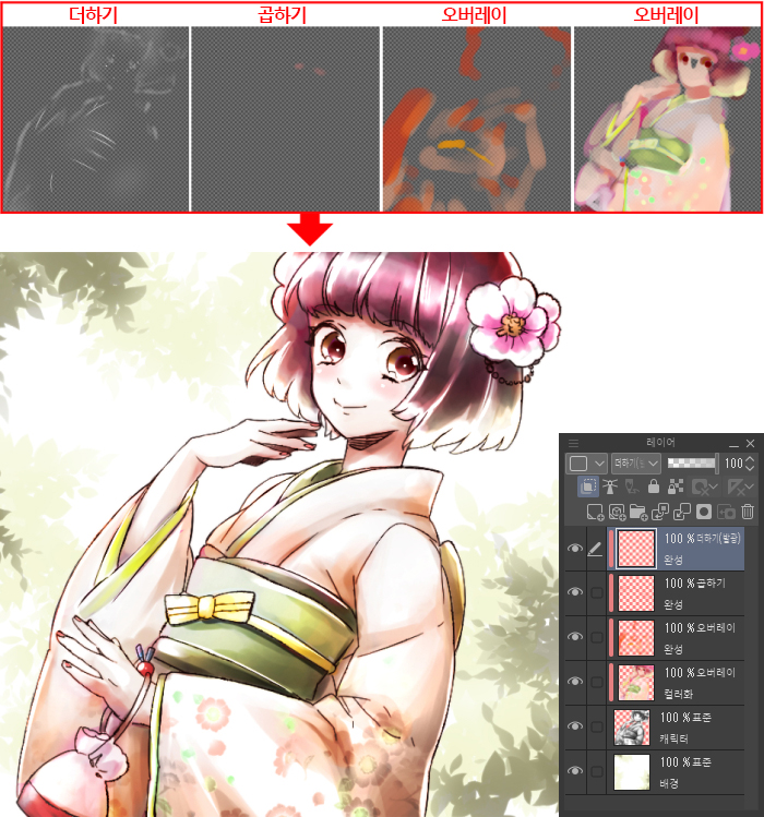 ‘오버레이‘ → 밝은 부분은 더 밝아지고 어두운 부분은 더 어두워집니다. 밑바탕인 회색에 대해 컬러로 칠했을 때 사용하는 기본 모드입니다.