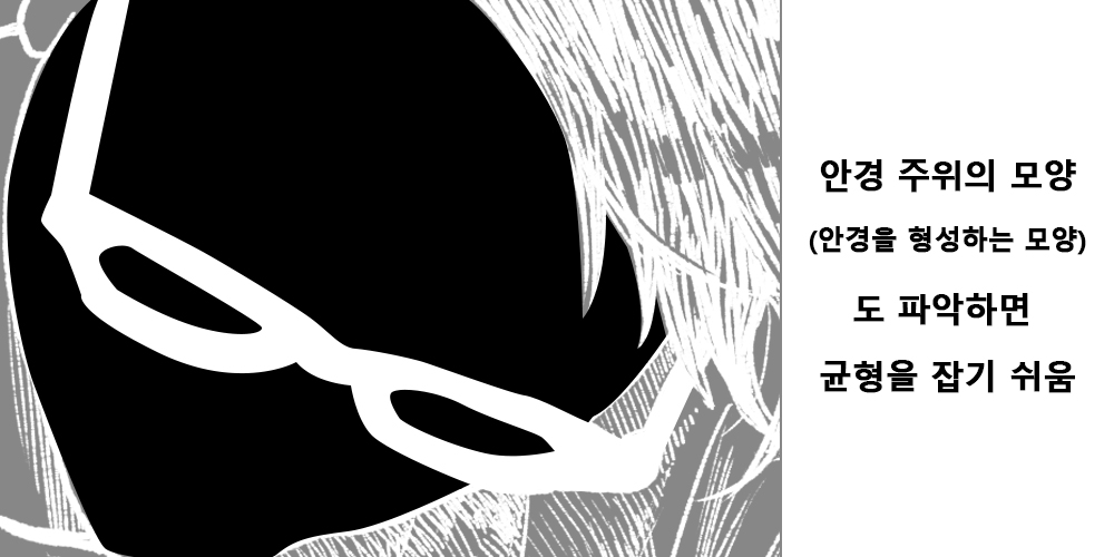 캐릭터의 모양을 잡을 때 캐릭터 그 자체를 보는 것이 아니라 캐릭터의 모양을 이루는 선을 경계로 음화와 양화로 파악할 수 있도록 합시다.