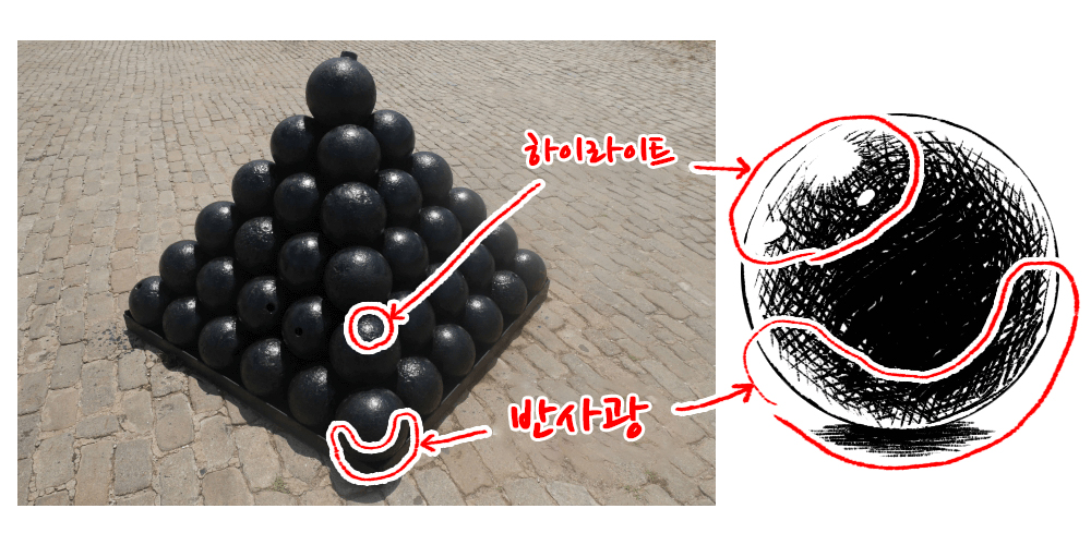 예를 들면 철의 질감 표현을 만화 그림으로 살펴봅시다.