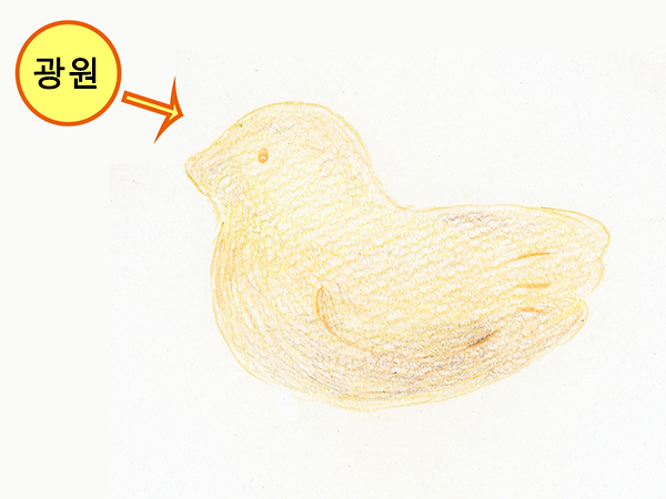 빛이 강하게 비쳐 하얗게 광택이 나는 부분은 도화지의 흰 부분을 남겨 표현합니다.
