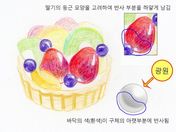 딸기의 둥근 모양을 고려하여 아래 부분은 밝은 반사광을 남기고 칠합니다.