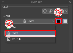 ②, ③의 작업은 [레이어 속성] 팔레트에서 레이어의 [표현색]을 [그레이]로 변경(②)하고 표현색을 검은색으로만 설정(③)하면 화상을 쉽게 추출할 수 있습니다.