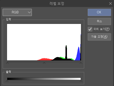 [편집] 메뉴 → [색조 보정] → [레벨 보정]에서 조정합니다.