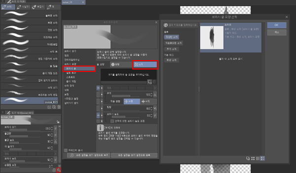 [브러시 모양] → [브러시 끝] → [소재]에서 작성한 화상을 선택하여 등록합니다.