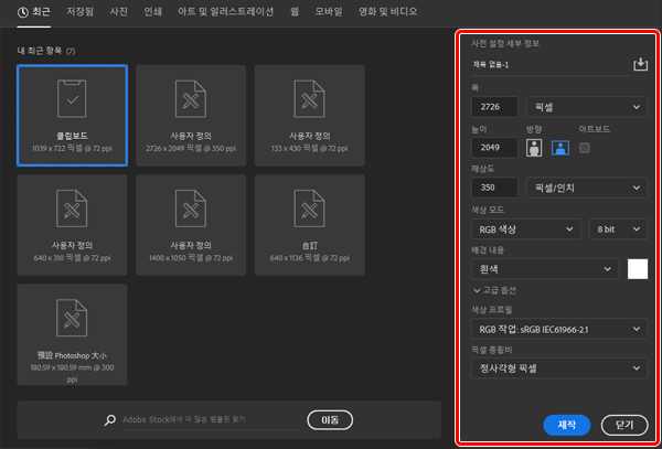 Photoshop에서 신규 캔버스를 작성합니다. 해상도는 ‘350픽셀/인치’로 설정합니다.