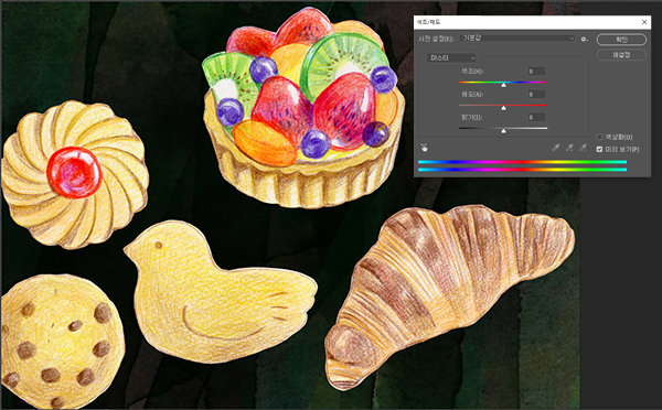 [이미지] → [조정] → [색조/채도]를 열고 각 과자의 원본 그림에 들어간 레이어에 대해 색을 조정했습니다.