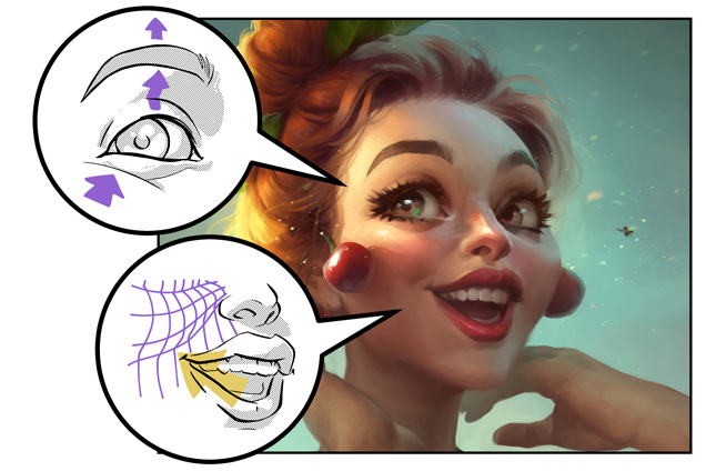 눈썹은 위로 올리고 뺨은 아래 눈꺼풀과 겹치도록 합니다. 좌우로 벌어진 입이 뺨을 밀어올려 둥근 모양이 되도록 합니다. 이로써 생생한 웃음이 완성되었습니다.