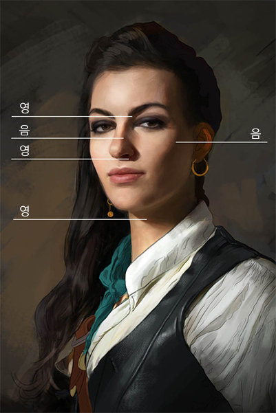 ‘음’은 물체의 빛이 닿지 않는 한쪽 면에 생기는 어두운 부분을 말합니다. 한편 ‘영’은 어떤 물체가 빛을 가려 다른 물체에 드리워지는 어두운 부분을 말합니다. 여기에서는 코로 인해 얼굴에 드리워진 어두운 부분이 이에 해당합니다. ‘영’의 모양은 선명한 것이 많은 반면 물체 주변에 생기는 ‘음’은 그라데이션을 만듭니다.