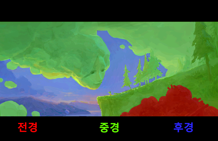 형태(물체의 윤곽), 명도, 색 등의 요소에 따라 전경, 중경, 후경을 나눌 수 있습니다. 작품에 깊이를 더하기 위해 이러한 요소는 빼놓을 수 없습니다.