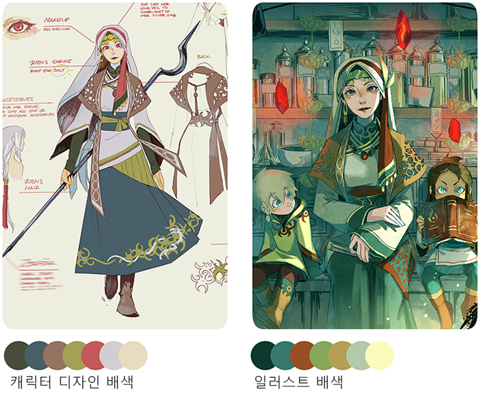 일러스트나 디자인에 사용되는 색의 배열과 조합을 배색이라고 합니다. 디자인에서의 배색은 주로 고유색(자연광 아래에서 보이는 물체 고유의 색)을 말합니다. 한편 일러스트의 배색은 분위기나 느낌을 표현하기 위해 사용됩니다. 일러스트의 고유색은 주위의 환경색에 영향을 받습니다. 예를 들어 Rien 캐릭터 디자인의(왼쪽 그림) 회청색 스커트는 일러스트(오른쪽 그림)에서 초록색 환경광의 영향으로 어두운 청록색으로 보입니다.