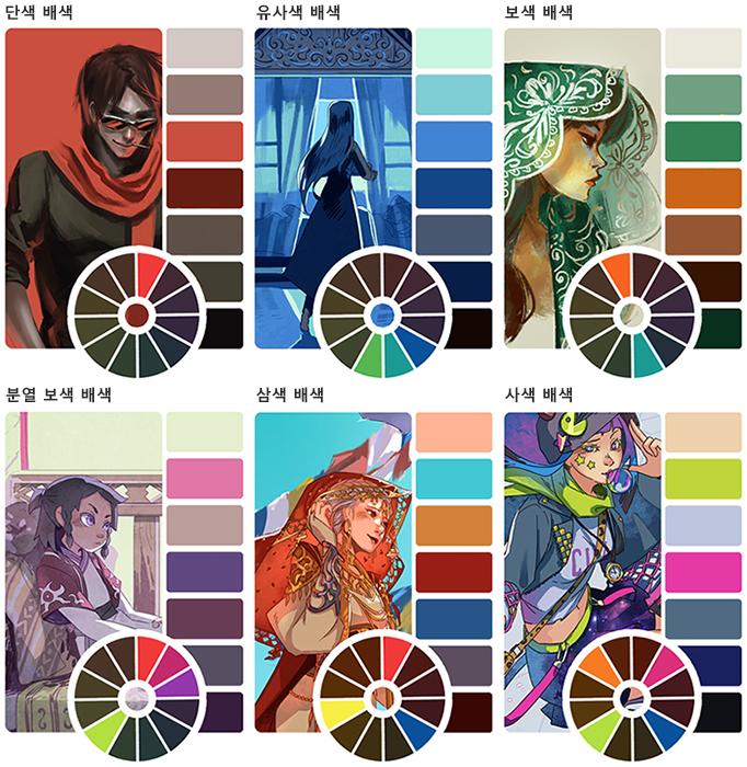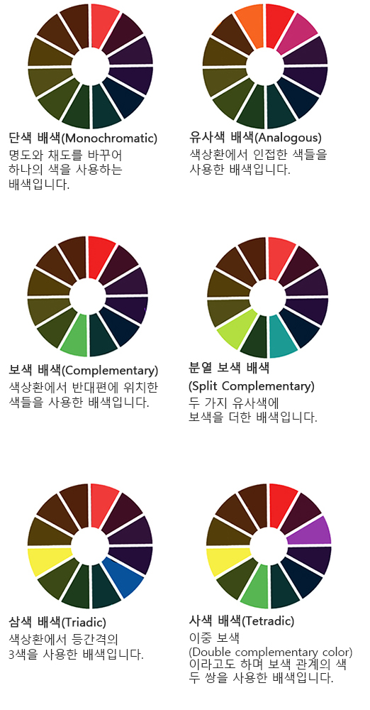 여러 색들을 가까이 배치하면 색은 서로 영향을 받습니다. 서로 보완하는 경우도 있지만 다른 색을 돋보이게 하거나 조화되지 않아 두 색 모두 칙칙해져 버리기도 합니다. 색채 이론에 따르면 색상환의 색에 맞추어 배색하여 조화로운 작품이나 디자인을 만들어 낼 수 있습니다. 아래는 색채 이론에 기초한 조화로운 색 조합의 예입니다.
