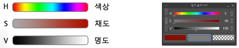 ● 명도, 강도, 색상의 이동을 CLIP STUDIO PAINT 색상환에서 보면 아래와 같습니다.