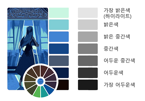 ● 이 색에 인접한 색은 명도가 높거나 낮은 색입니다.