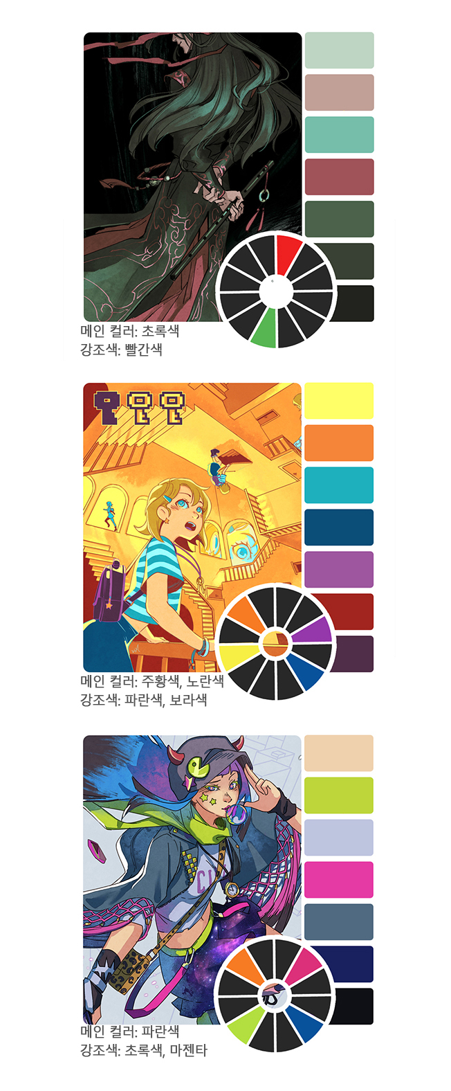 앞서 설명한 색채 이론을 기초로 한 조화로운 배색을 제 일러스트를 예로 보여드리겠습니다.