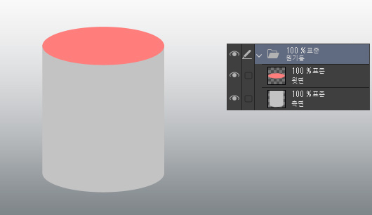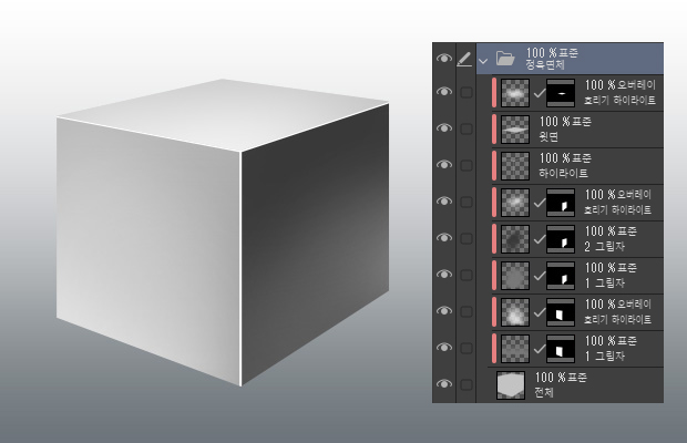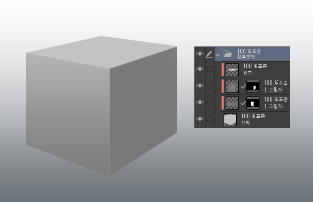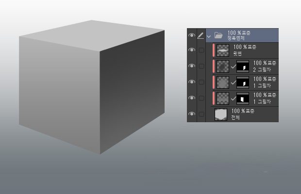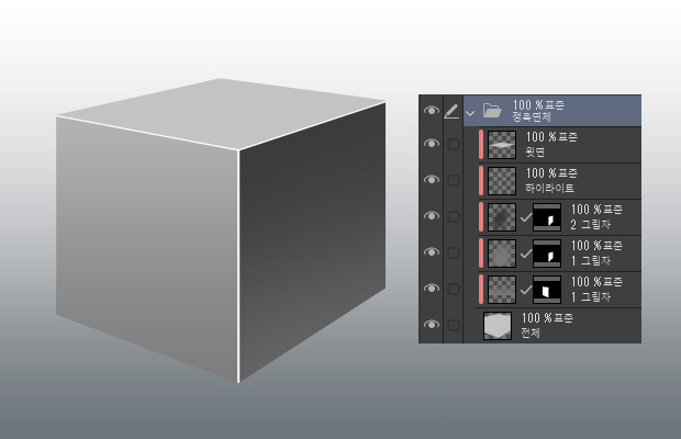 측면과 윗면으로 레이어를 나누어 두면 이후의 과정에서 각 면의 그림자와 하이라이트를 칠하기 쉽습니다.