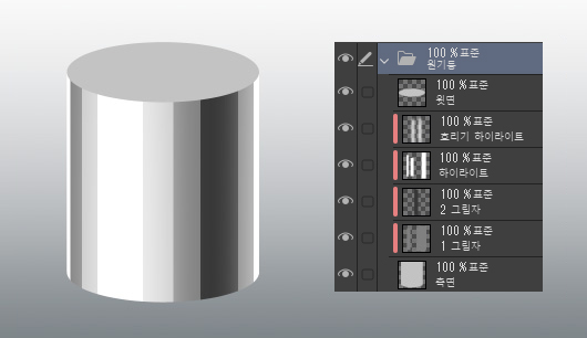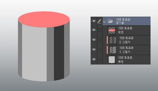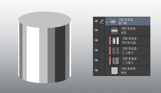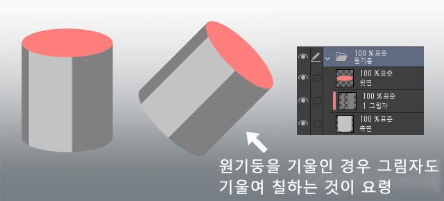 그림자를 원기둥의 축과 평행이 되도록 똑바로 칠하는 것이 요령입니다.