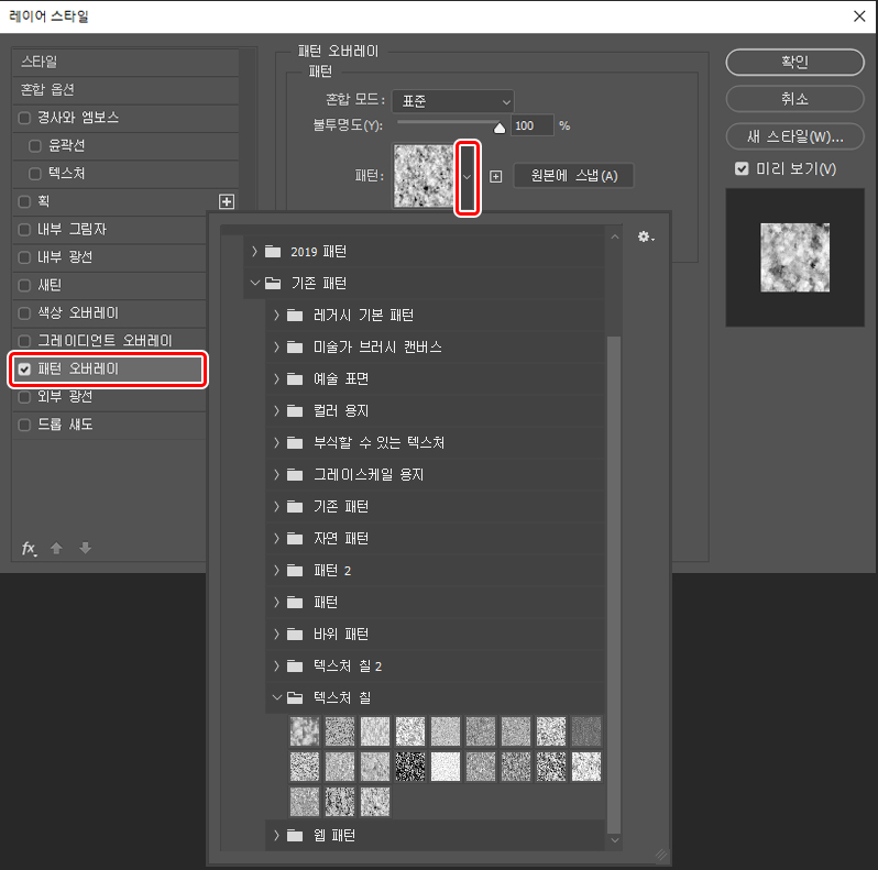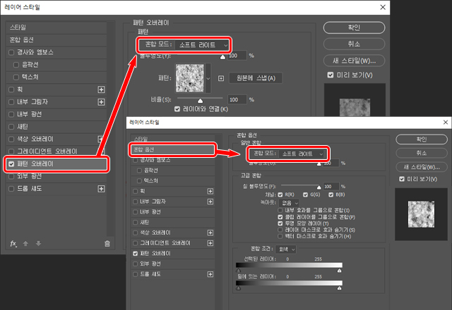 텍스처의 그리기 모드를 ‘소프트 라이트’로 변경하고 불투명도를 낮게 설정합니다.