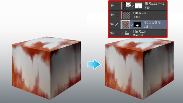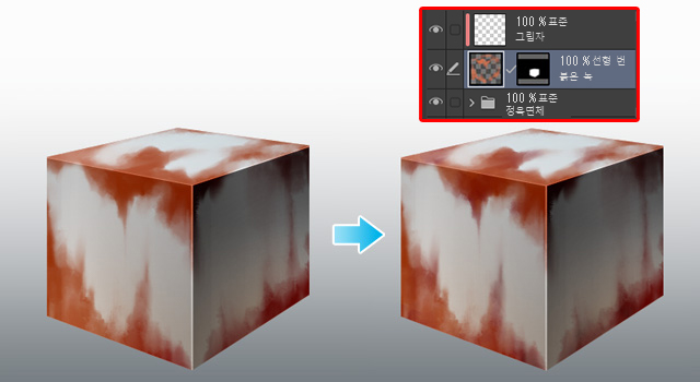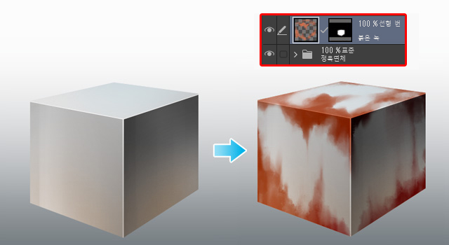 ‘붉은 녹’ 레이어에 녹을 그리고 정육면체의 그림자와 일치하도록 레이어의 그리기 모드를 ‘선형 번’으로 설정했습니다.