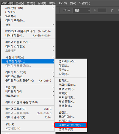[레이어] 메뉴 → [새 조정 레이어] → [그레이디언트 맵]을 선택하여 그레이디언트 맵 레이어를 작성합니다.
