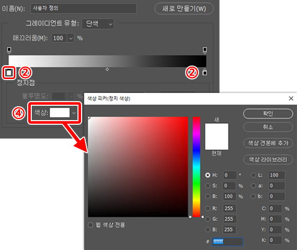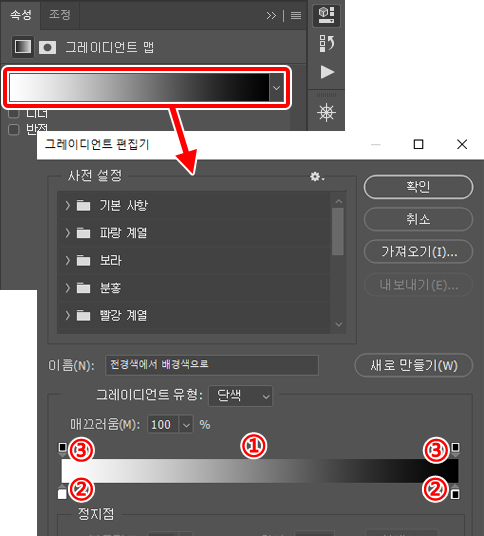 ‘그레이디언트 편집기’의 ① 부분이 설정한 그라데이션 색입니다.