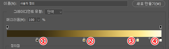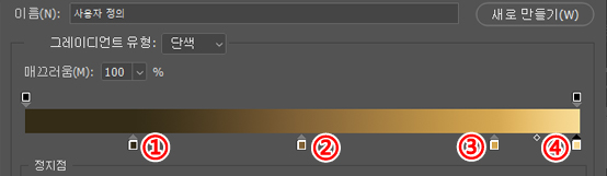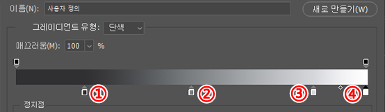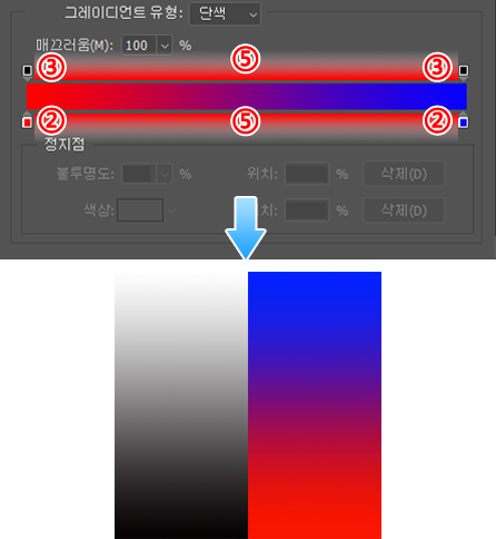 ①의 정지점이 그라데이션 색을 설정하는 부분으로 비슷한 모양의 ③의 정지점은 색의 불투명도를 나타냅니다.