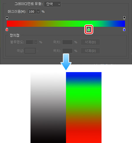 예를 들면 ②의 정지점을 추가하고 녹색으로 설정하여 위의 화상을 아래 그림과 같이 바꿀 수도 있습니다.