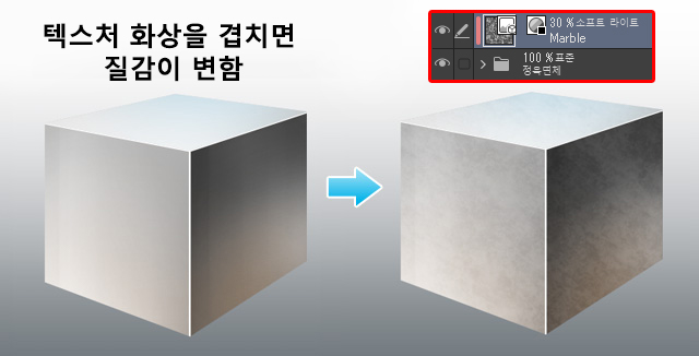 이 경우 ‘매트 텍스처’ 레이어에 레이어 마스크를 추가하여 불필요한 부분을 흐린 브러시 등으로 지우고 적당히 조정합시다.