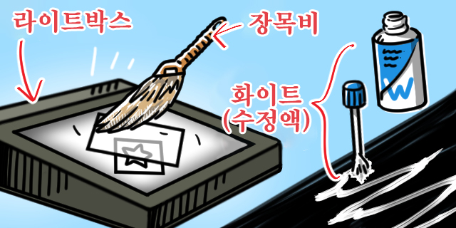 펜 선 따기한 선을 수정하기 위해서는 수정액이 필요합니다. 또한 먹칠 안의 하얀 선이나 눈동자의 하이라이트 등에 사용할 수도 있습니다.