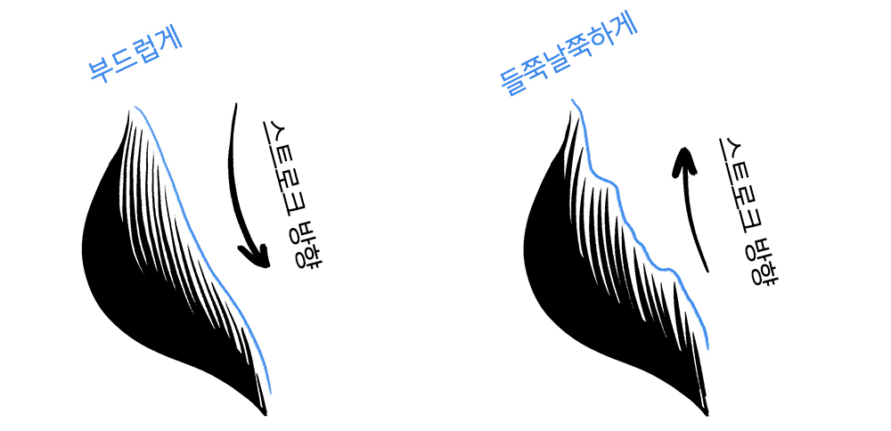 대신 가장 가는 지점에서 시작하여 검게 칠한 영역으로 선을 그려 보세요. 이런 식으로 가는 선을 일관되게 표현할 수 있으며 선이 더 깨끗하고 매끄러워집니다.