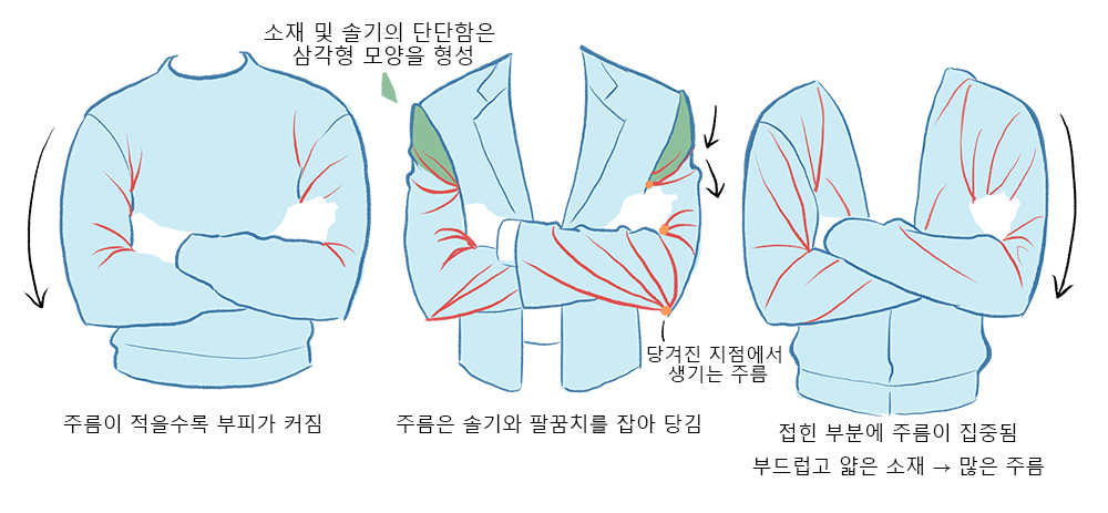 팔의 움직임은 주름이 나타나는 당겨지는 부분을 크게 좌우합니다.