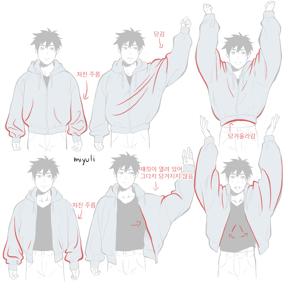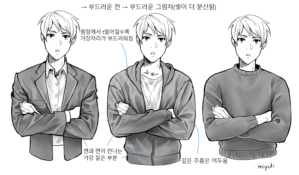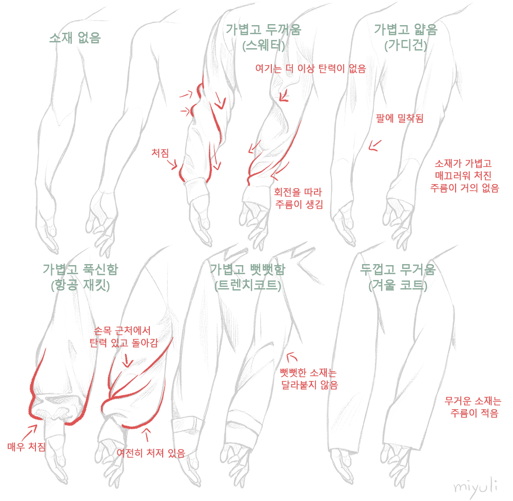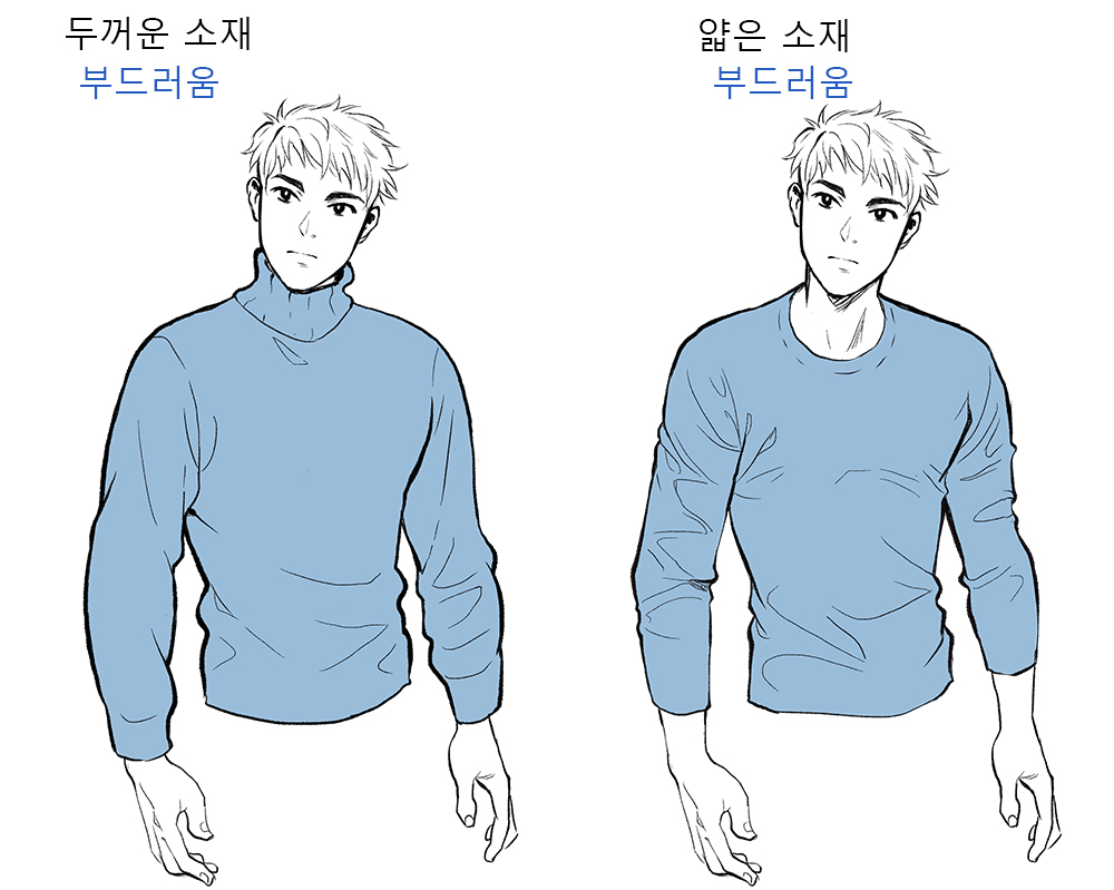 주름을 그릴 때 소재를 고려하는 것이 매우 중요합니다. 소재는 모두 적절한 주름의 위치를 형성하는 고유의 특성을 가지고 있습니다. 또한 그 질감에 따라 그림자가 생기는 곳이 달라집니다.