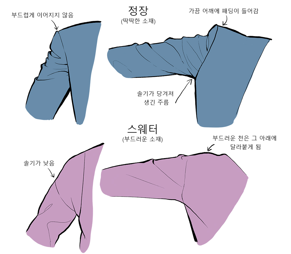 스웨터는 보통 팔 솔기가 더 내려가 주름이 많이 당겨지지 않습니다.