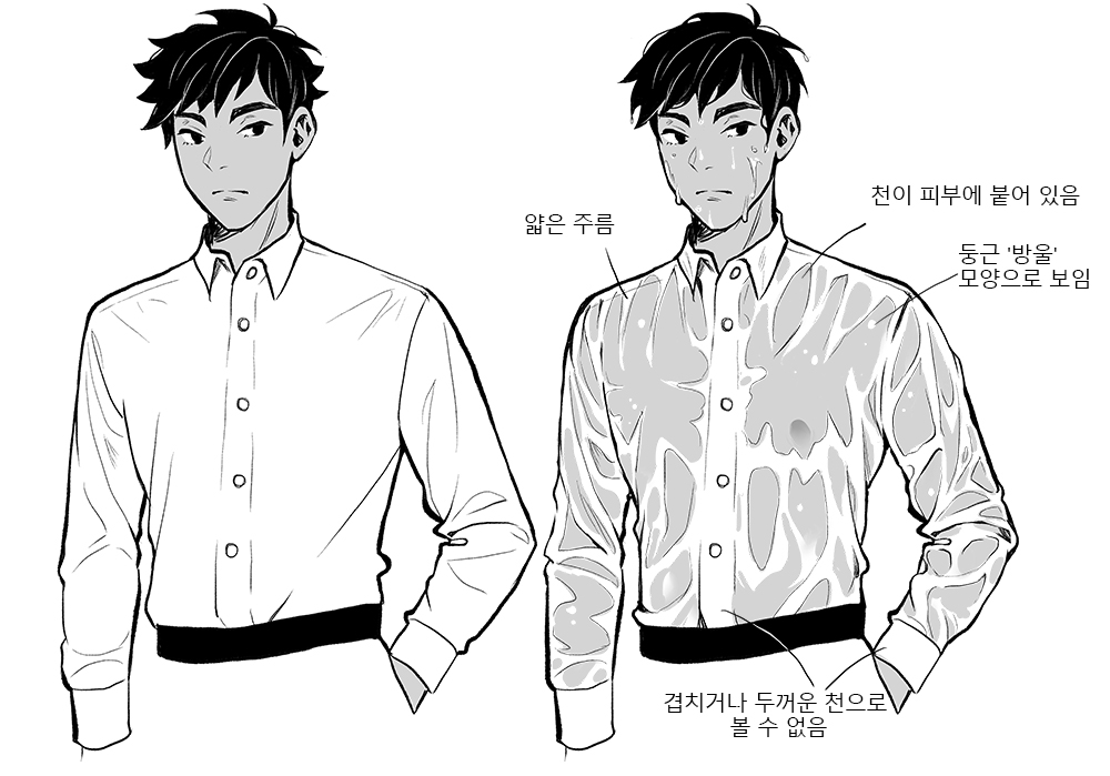 젖은 천은 마른 천과 달리 천 아래의 형태에 더 달라붙는 경향이 있습니다. 물은 가벼운 소재를 훨씬 더 무겁게 만들어 쉽게 움직이지 않게 합니다. 또한 얇은 천은 투명해집니다.