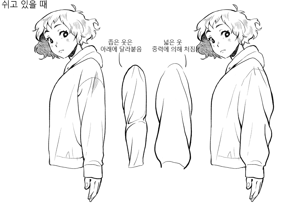 폭이 넓은 옷은 폭이 좁은 옷과 다른 주름을 보여줍니다. 꽉 끼는 옷은 밀착되어 몸을 감쌉니다. 헐렁한 옷은 당겨진 지점에서 아래를 향해 처진 많은 주름이 생깁니다.