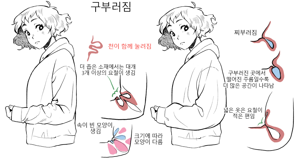 천에 요철을 그릴 때 원점과 부피감을 표시하는 것이 좋습니다. 3차원 공간에서 접힌 부분을 상상할 수 있을 때 시각적으로 차이가 납니다.