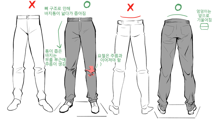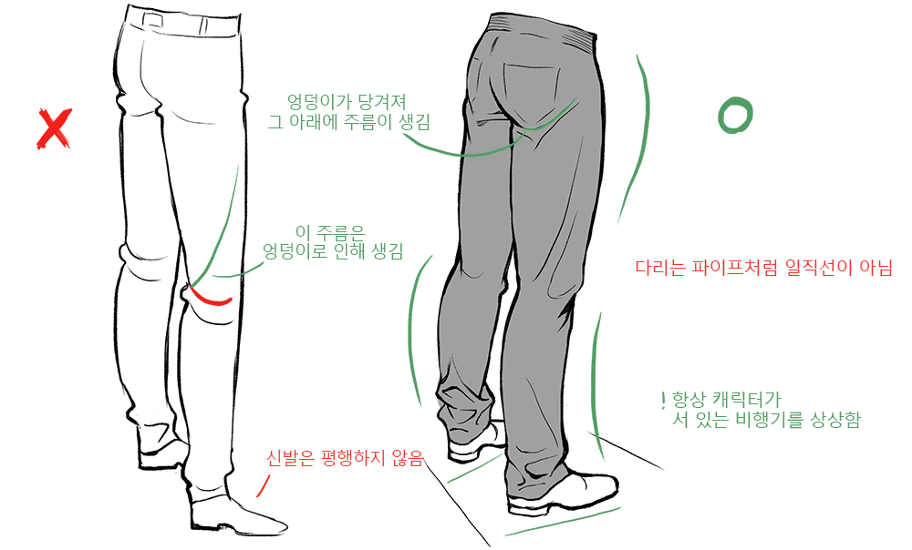 다리가 움직일 때 생기는 주름 모양에 주의합시다.