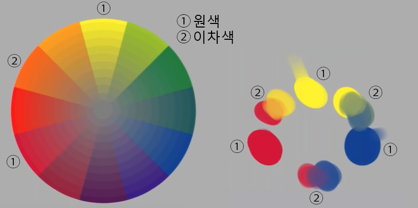 노란색, 빨간색, 파란색의 삼원색(①)으로 이루어져 있습니다. 이 원색들을 혼합하여 이차색(②)이 만들어집니다. 각각 주황색, 보라색, 녹색입니다. 컬러써클의 바깥쪽은 그 색들의 혼합 방법에 따라 구성되어 있습니다.