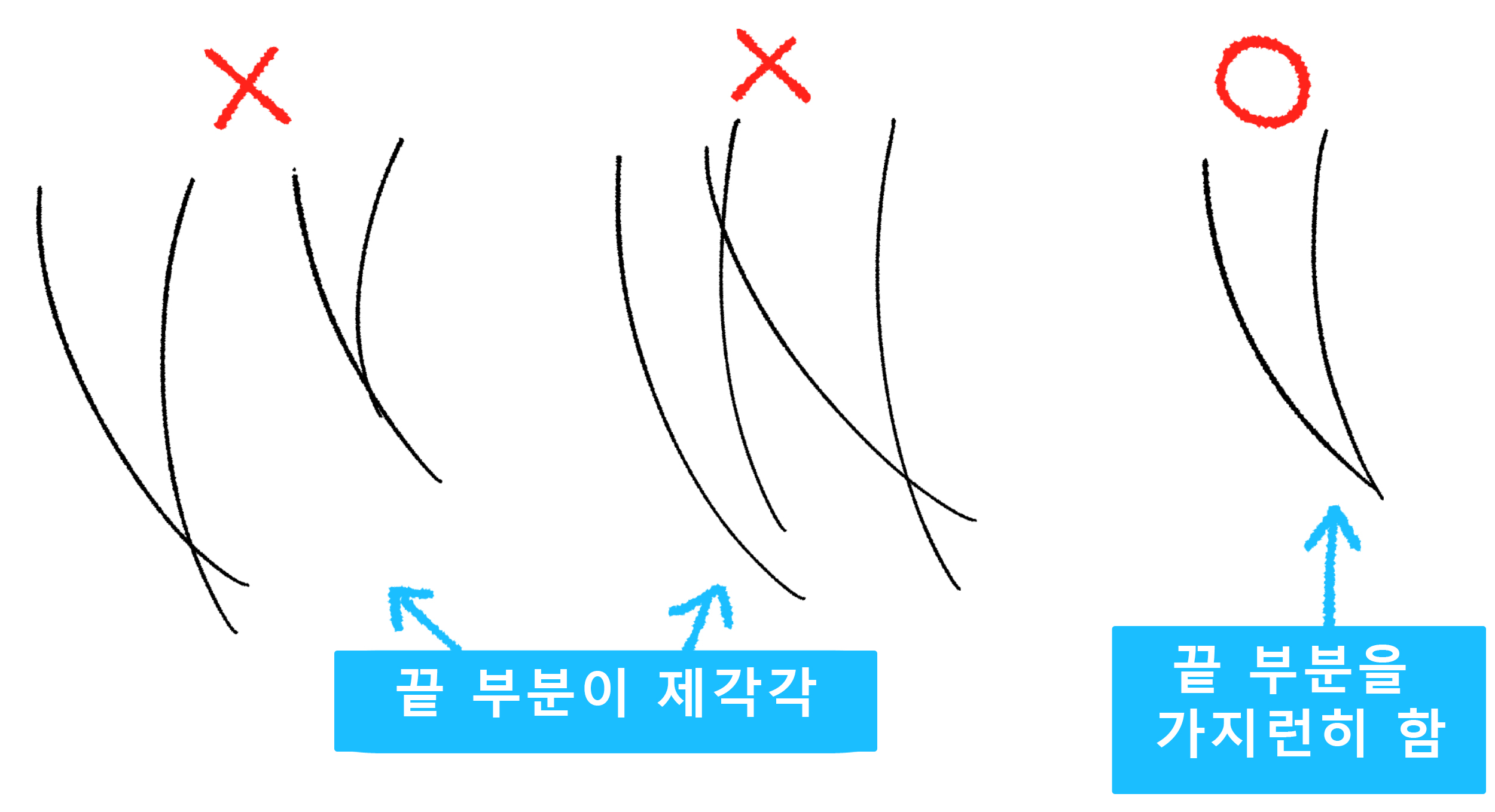 또한 끝 부분은 일정한 굵기가 아니라 굵고 가는 머리 다발을 번갈아 그리거나 굵은 머리 다발을 그린 후 가는 머리 다발을 몇 가닥씩 그리면 자연스러워집니다.
