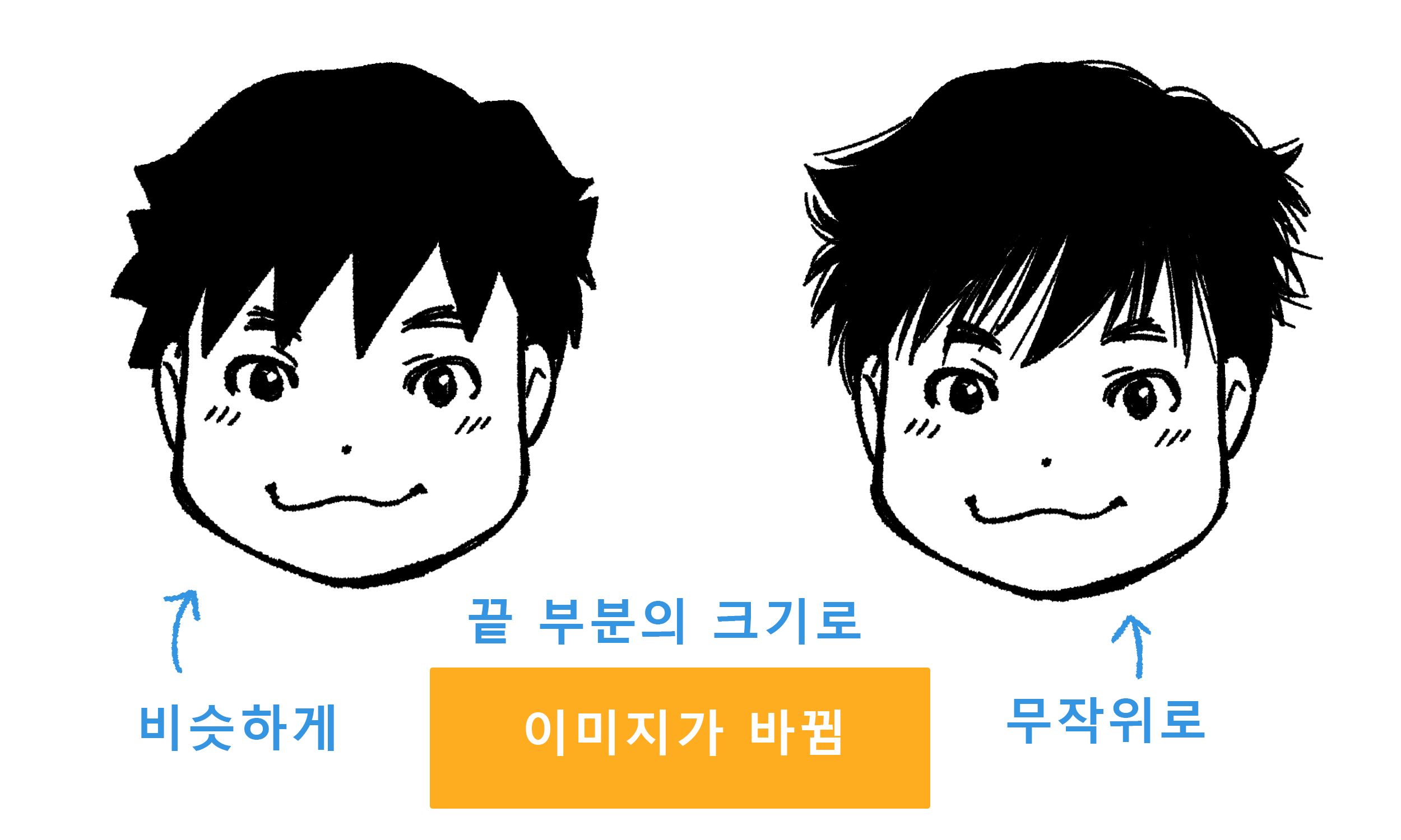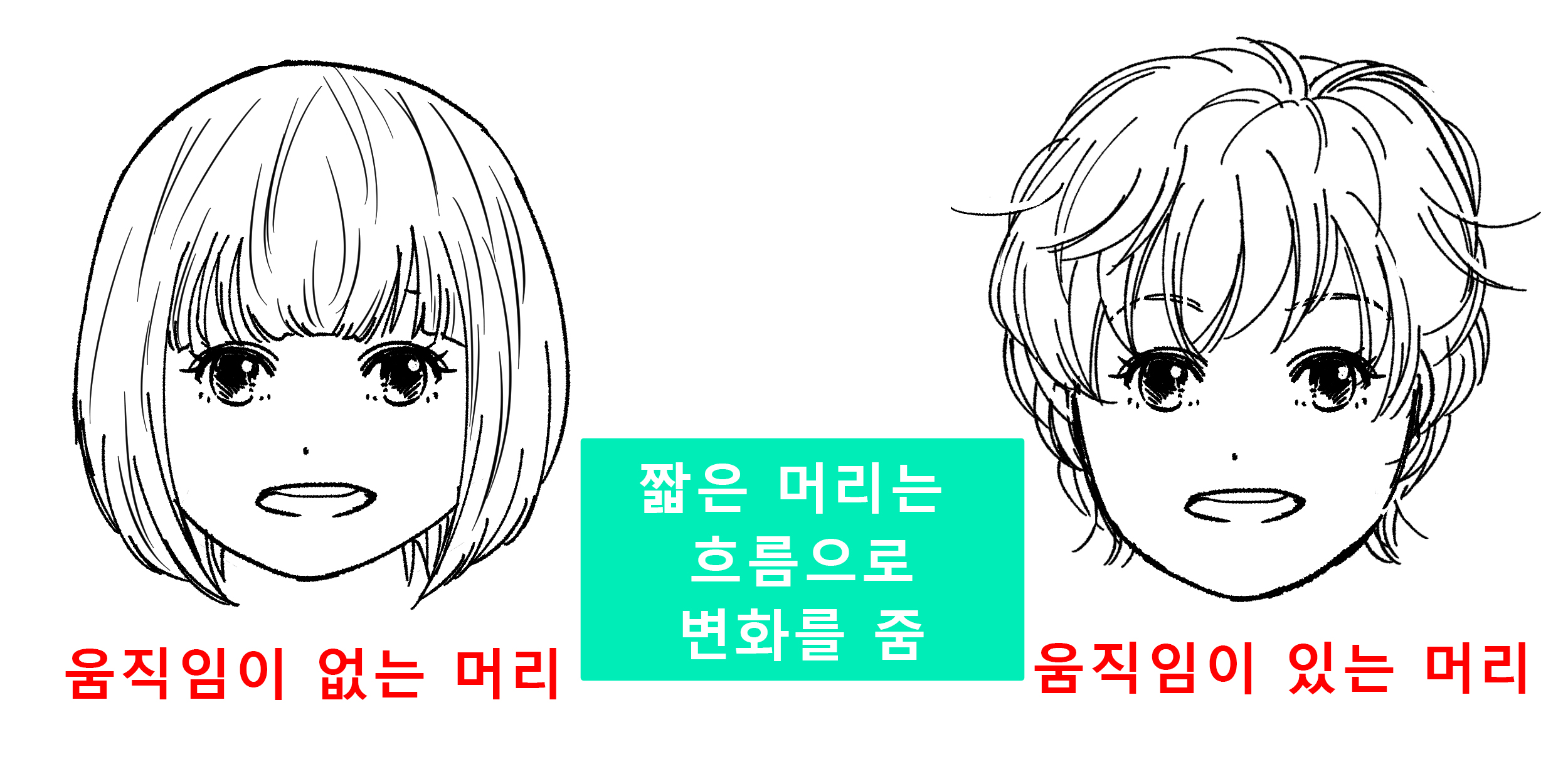 는 식으로 각각 변화를 주면 다양한 캐릭터의 헤어스타일을 그릴 수 있습니다.