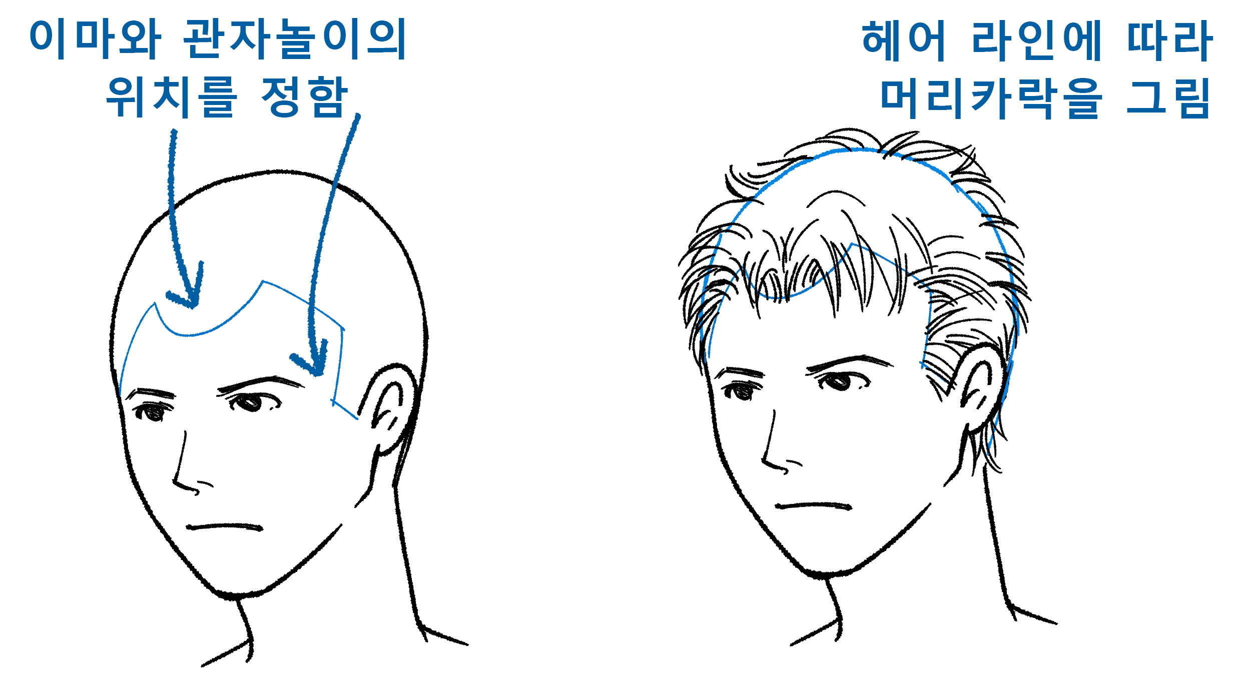 머리카락은 두개골을 덮고 있습니다. 그러므로 두상을 잘 생각하지 않으면 다 그린 후 머리만 크게 보이거나 뒤통수가 깎여진 것처럼 보입니다.